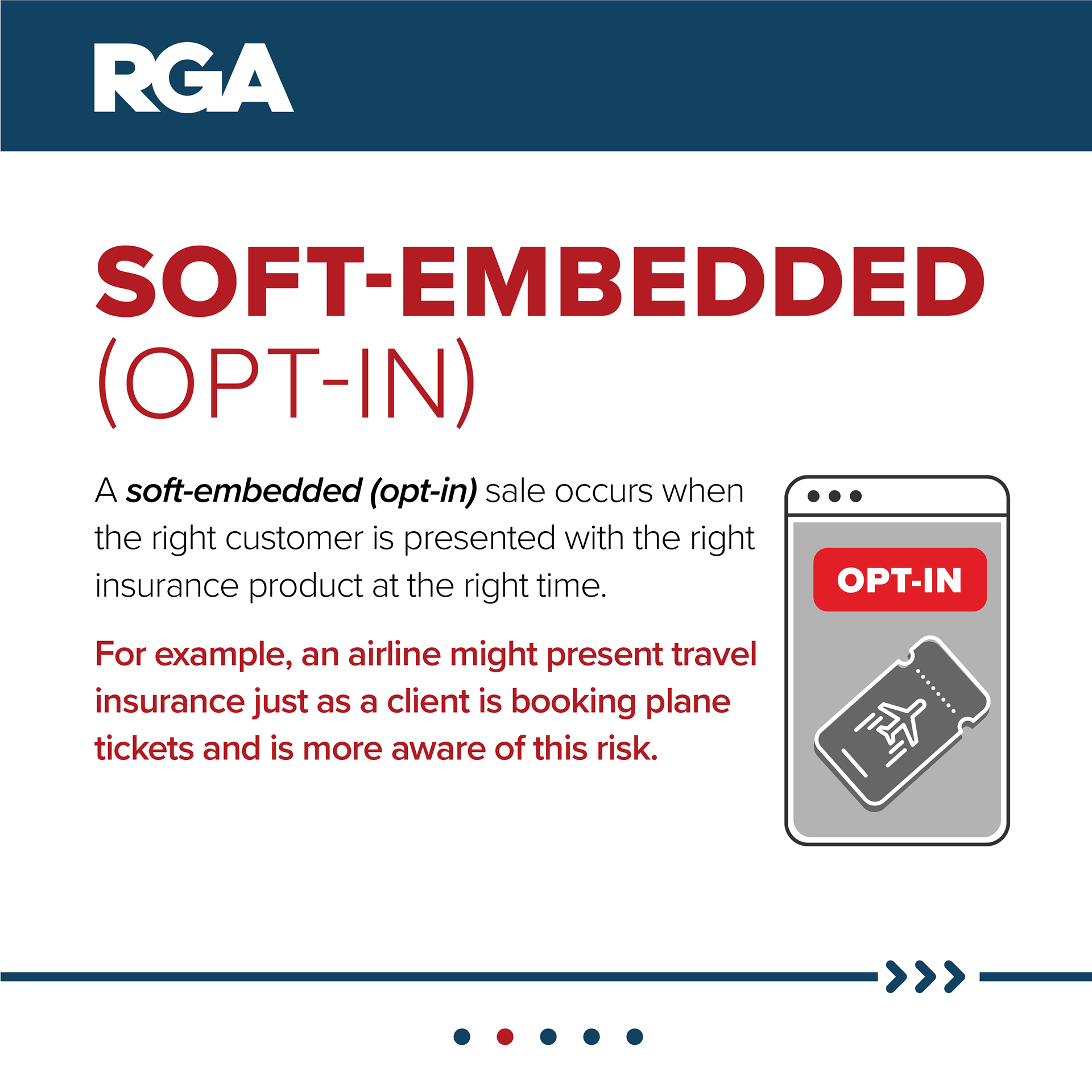 • A soft-embedded1 (opt-in) sale occurs when the right customer is presented with the right insurance product at the right time. For example, an airline might present travel insurance just as a client is booking plane tickets and is more aware of this risk.