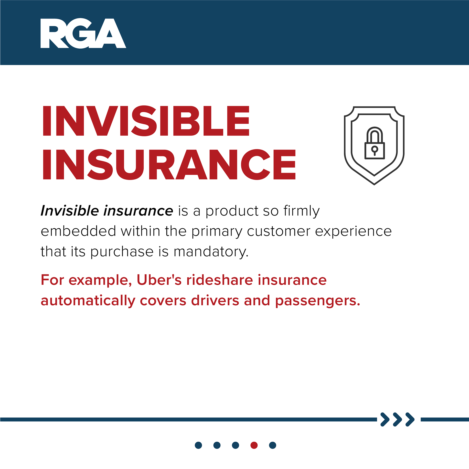• And then there is invisible insurance, or a product so firmly embedded within the primary customer experience that involvement is mandatory. For example, Uber’s rideshare insurance automatically covers drivers and passengers.